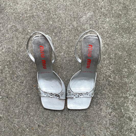 Miu Miu 1999 Metallic Silver Mesh Floral Daisy Slingback Heels