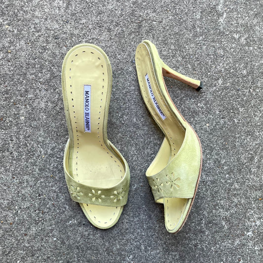 Manolo Blahnik Light Green Suede Flower Laser Cut Eyelet Sandal Heels