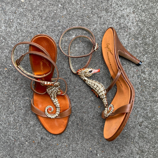 RARE Giuseppe Zanotti 2000s Brown & Orange Crystal Rhinestone Seahorse Sandal Heels