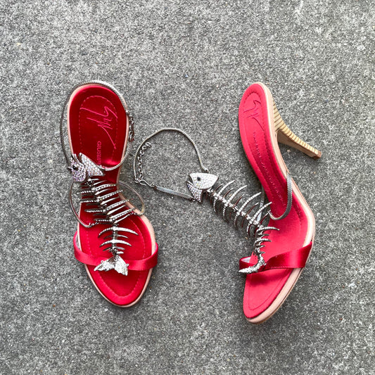 RARE Giuseppe Zanotti Red & Silver Rhinestone Encrusted Fishbone Heels