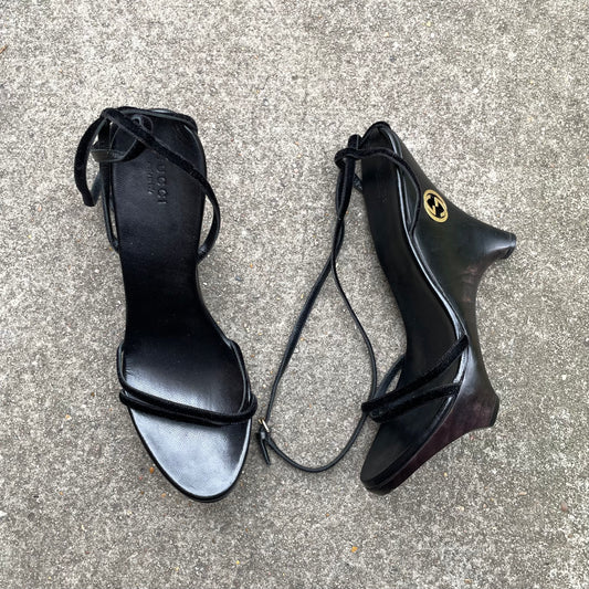 Gucci by Tom Ford 1996 “GG” Black Wood & Velvet Wedge Heels