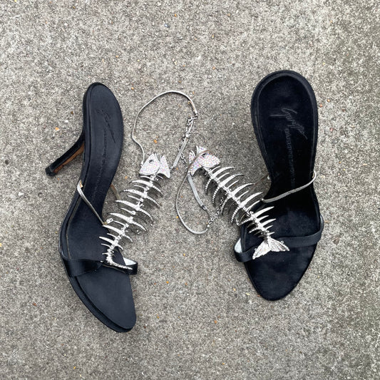 RARE Giuseppe Zanotti Rhinestone Fishbone Black Satin Sandal Heels