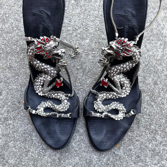 RARE Giuseppe Zanotti Silver & Red Dragon Black Satin Heels