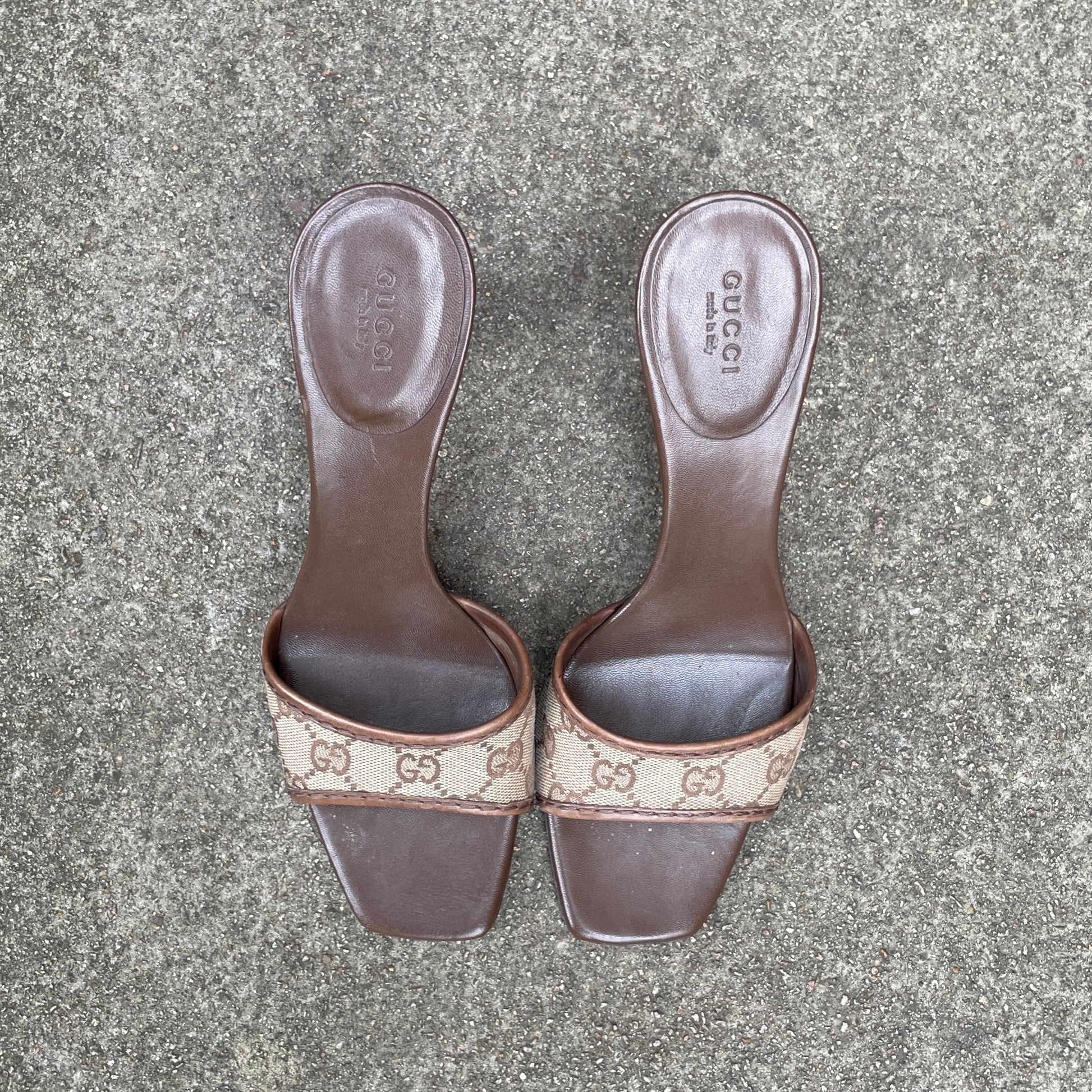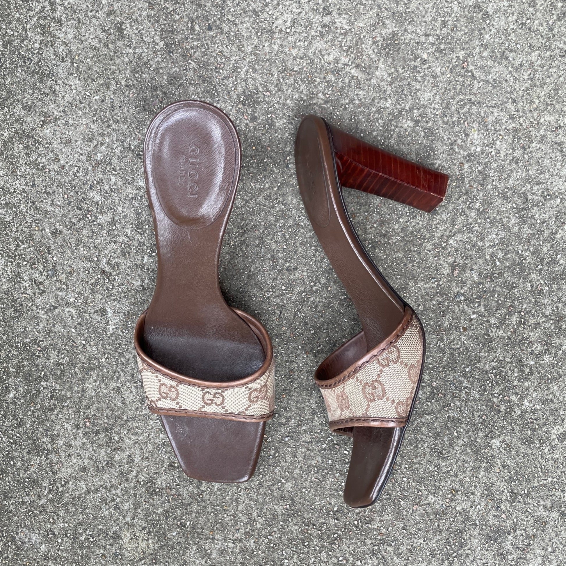 • Beautiful brown leather heels with the iconic Gucci monogram cloth on the strap
