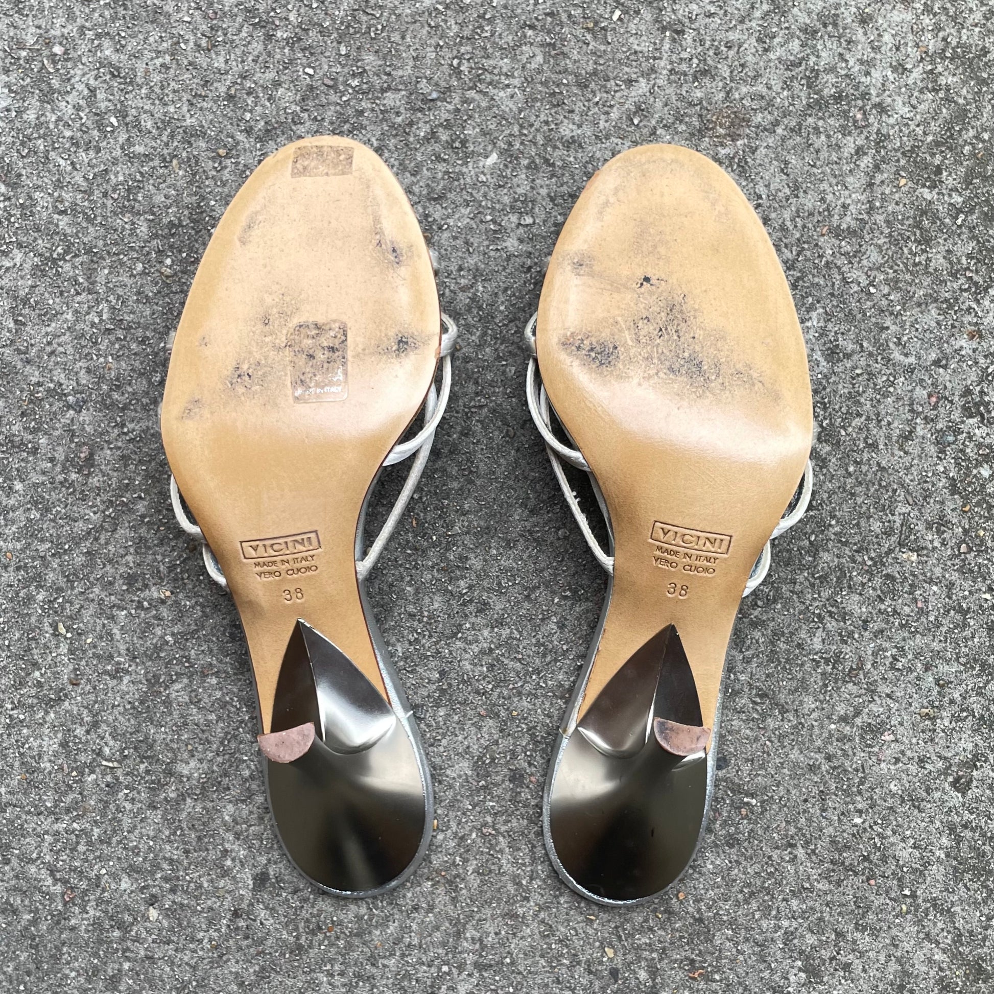 Good vintage condition. Light use on soles. Right shoe grape strap has come loose and needs to be glued back down.