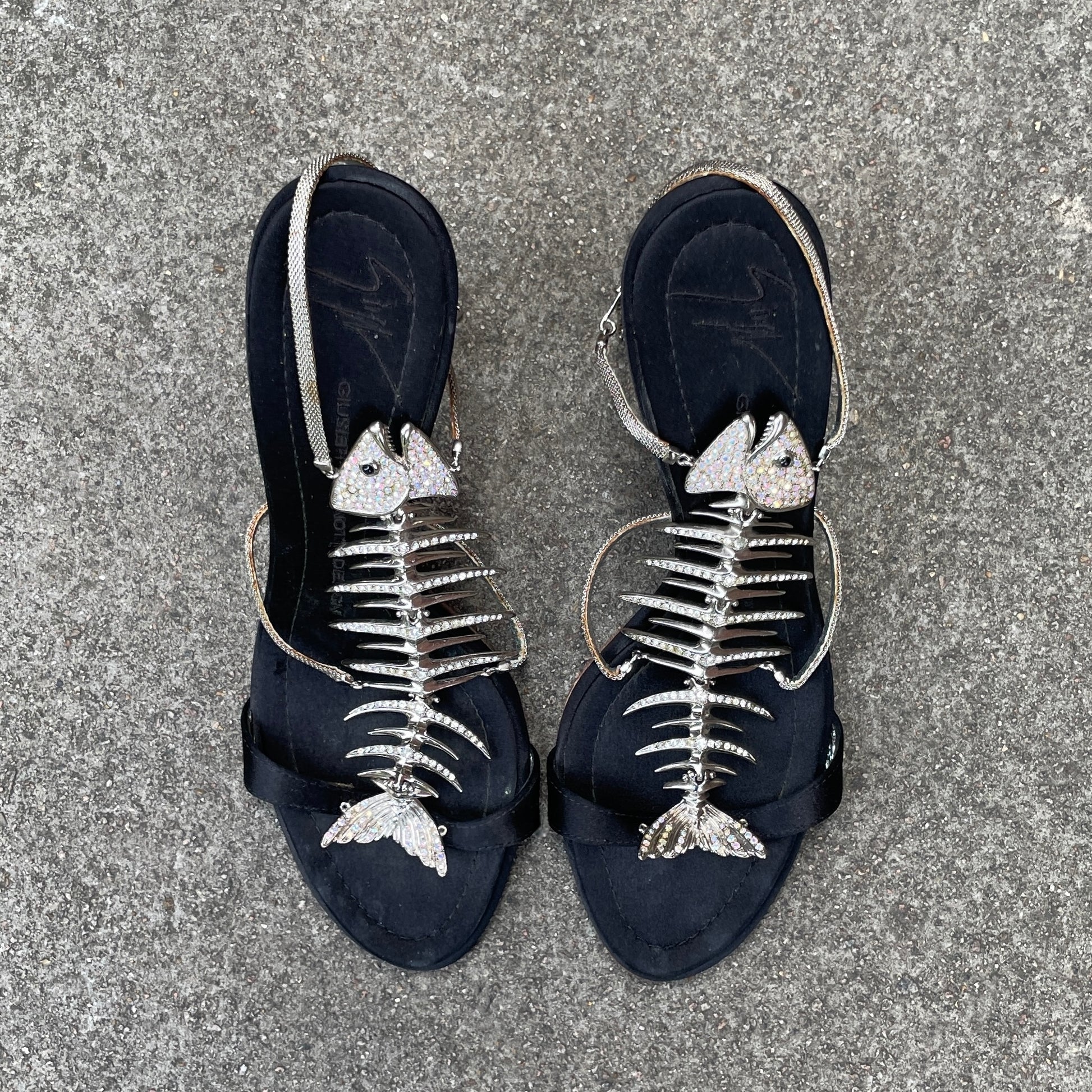 As seen on Samantha Jones in Sex and The City (2008) and on Beyonce at the VMAs (2003). The black satin makes this pair so classy! Featuring a metallic crystal skeletal fish bone motif. For the collectors 🖤