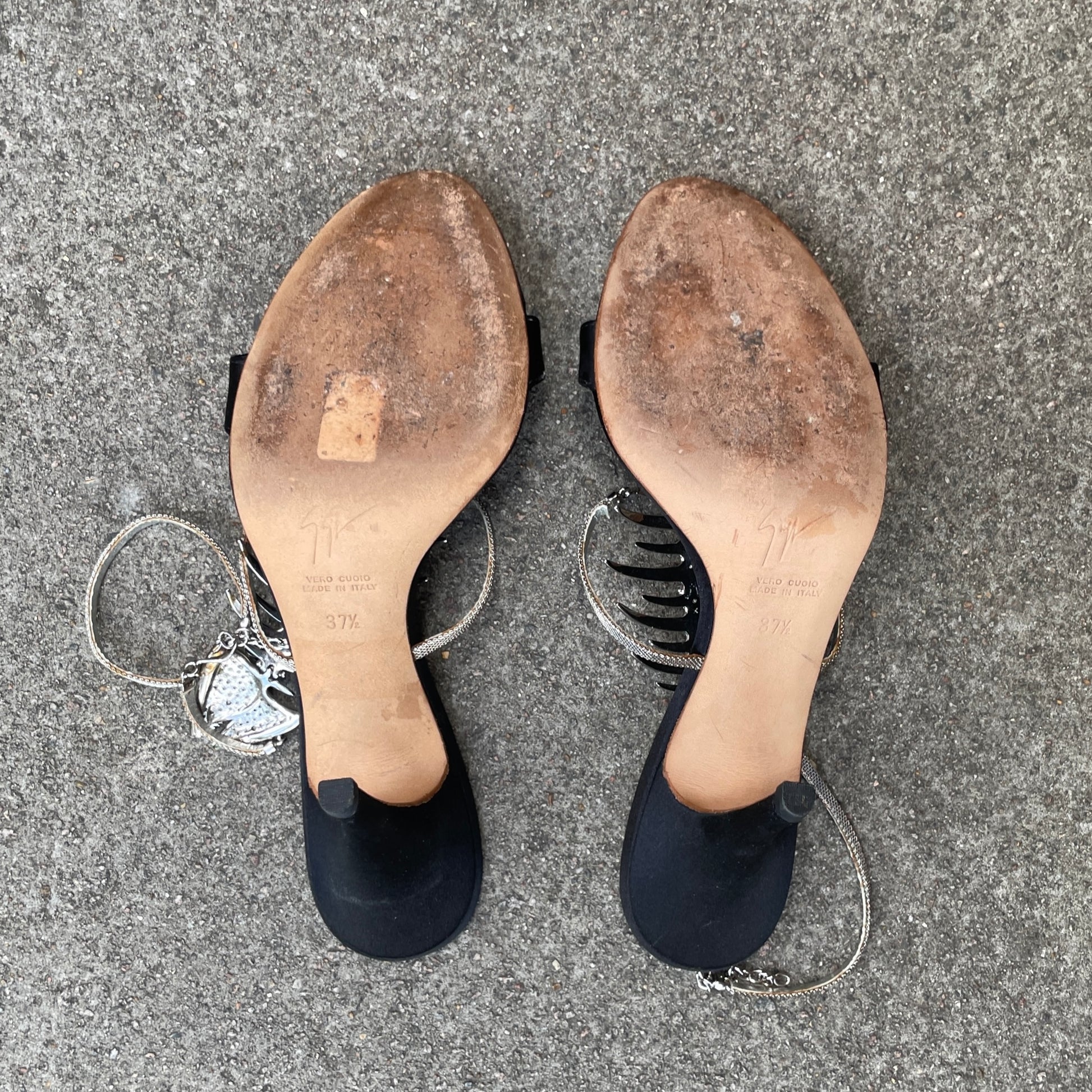 Good vintage condition. Some discolouration on straps. Heavy use on bottom soles. Some rhinestones have been restuck on but can be replaced.